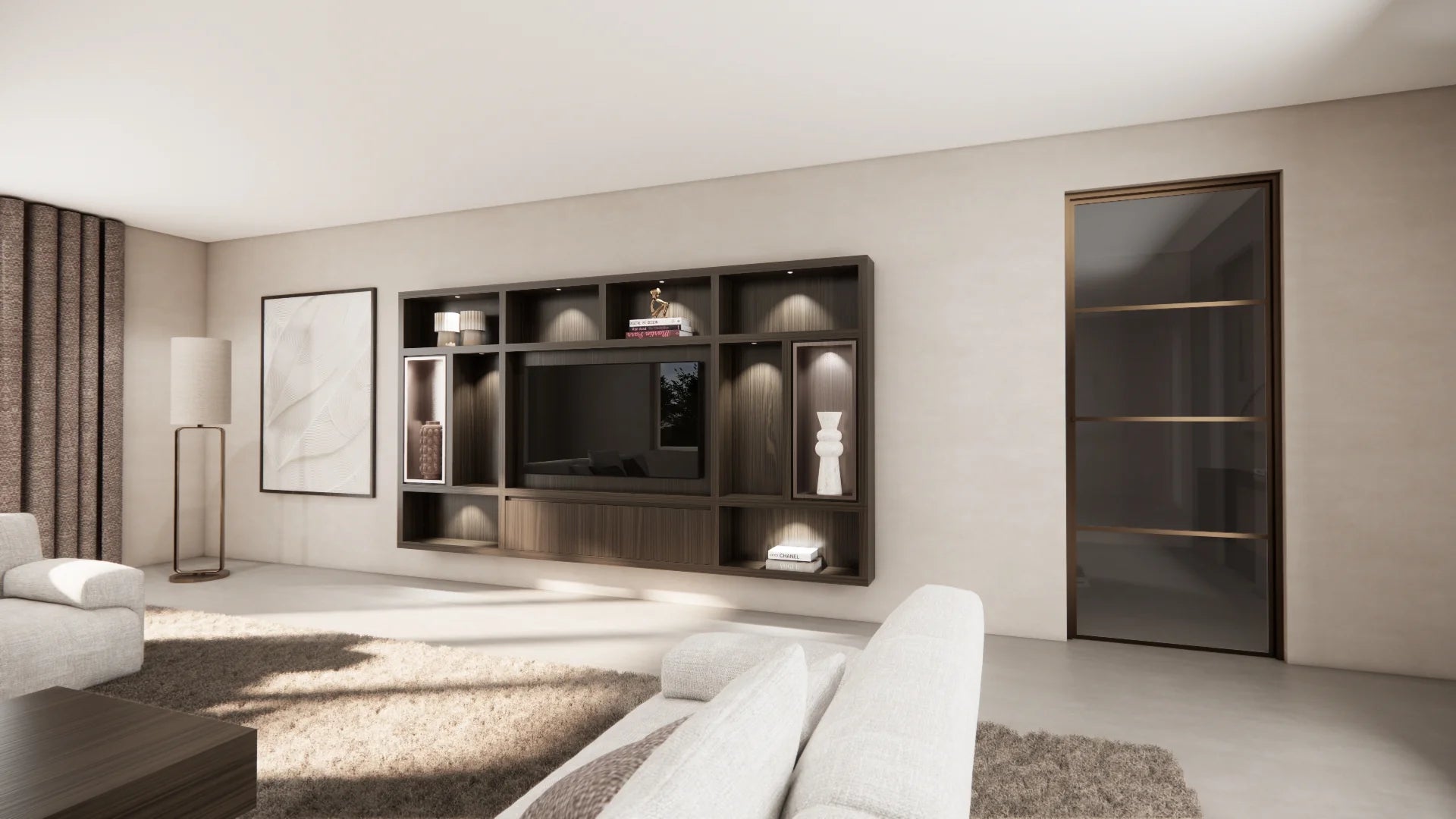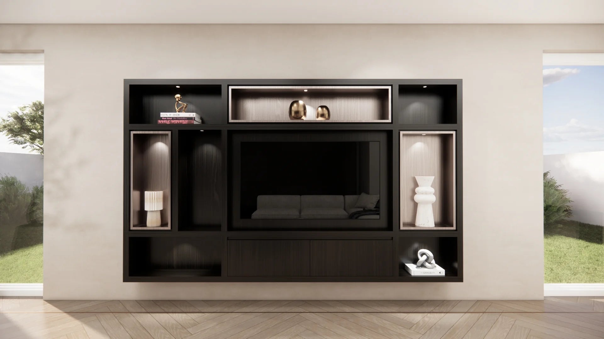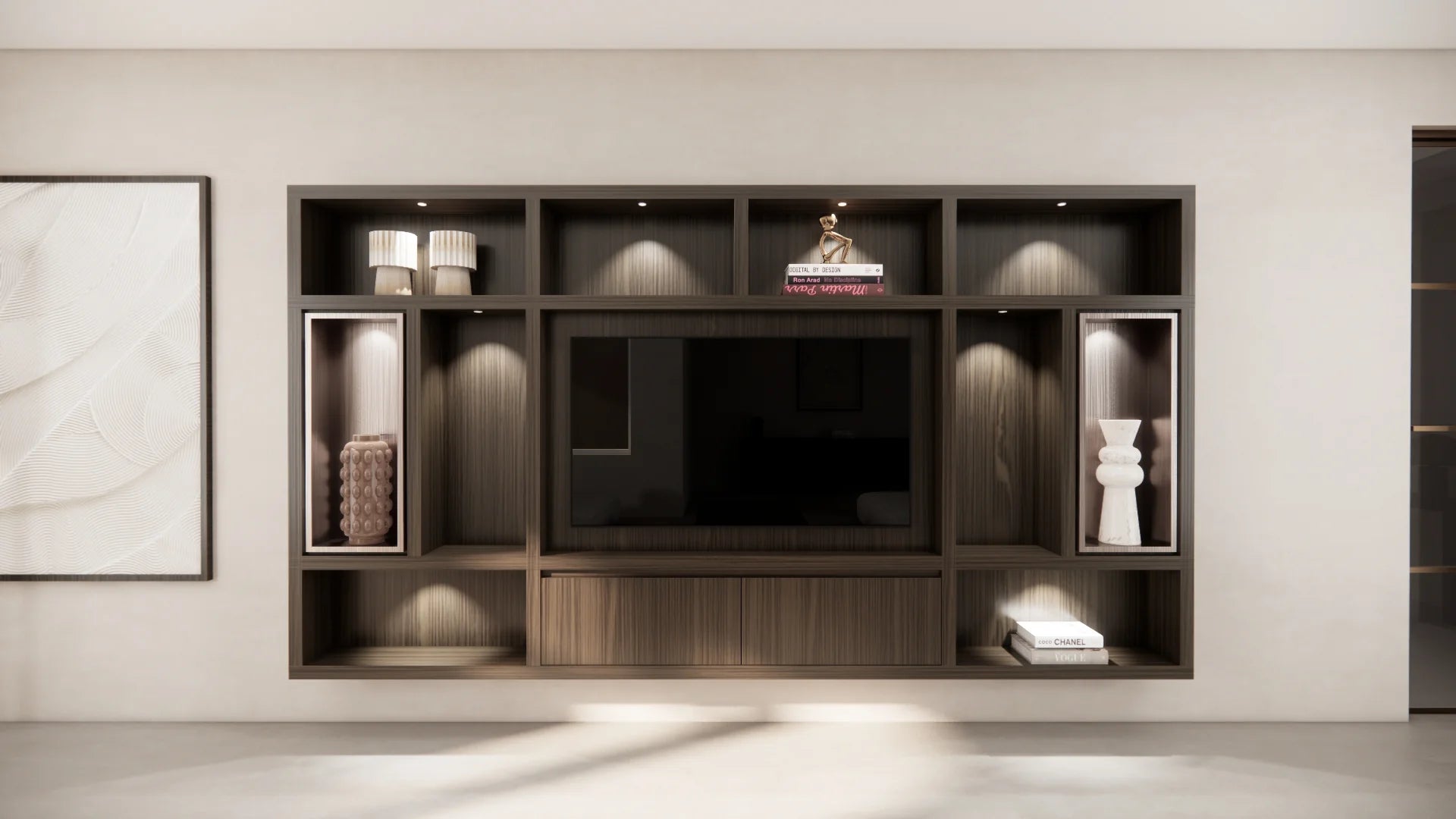 Dankzij het modulaire ontwerp stel je de cinewall volledig naar wens samen. Je bepaalt zelf de indeling van de open vakken, kleppen of nisruimte voor de tv. De geïntegreerde opbergruimte is niet alleen praktisch, maar blijft dankzij het strakke lijnenspel subtiel in het geheel.