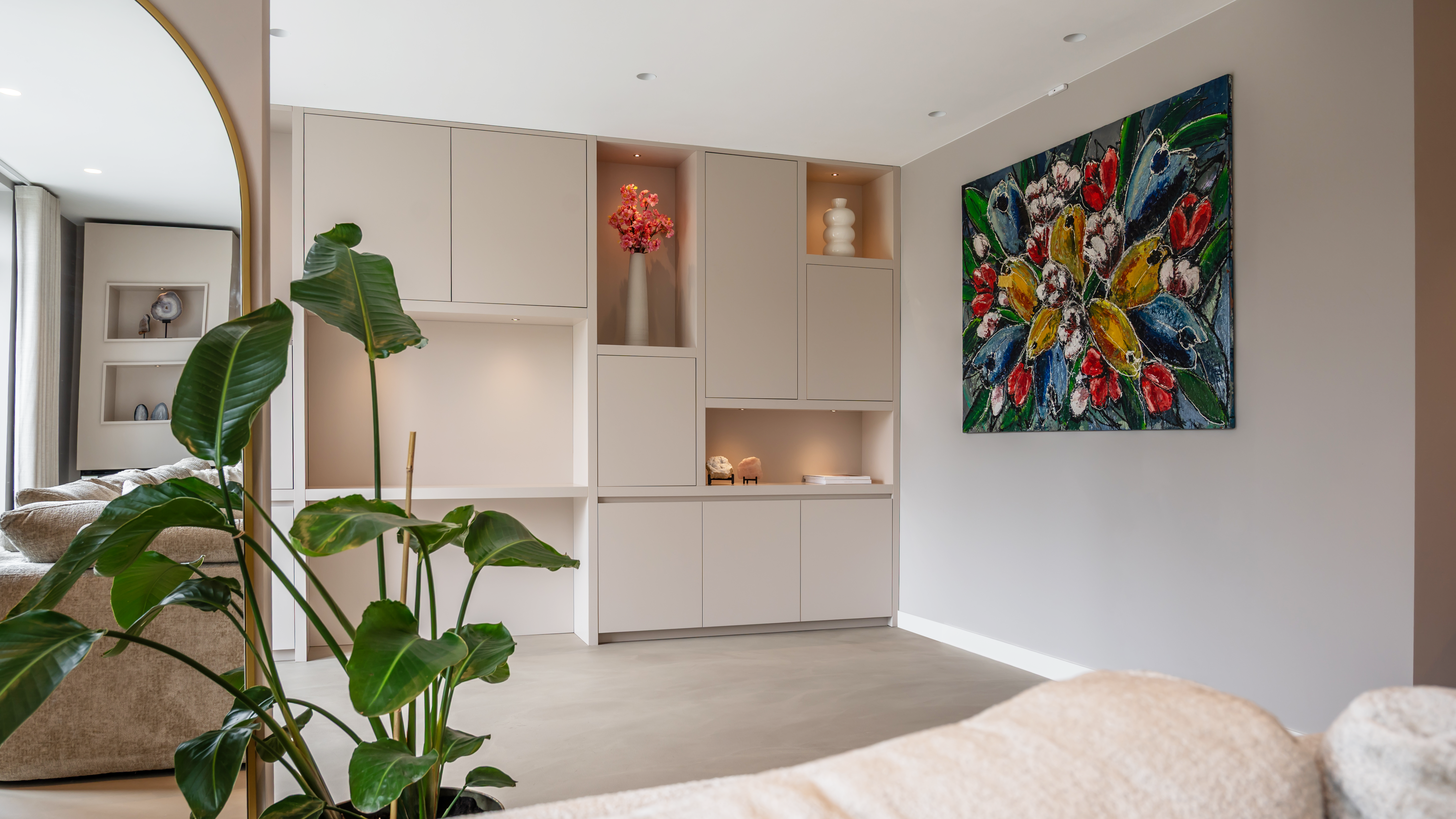 Een Zyan tv-meubel met haard, koof, colorboxen en sfeervolle verlichting, gecombineerd met een bijpassende vakkenkast en dressoir. Uitgevoerd in MDF in de populaire kleur Soft Clay. Een rustige, moderne tint die perfect past bij dit interieur.