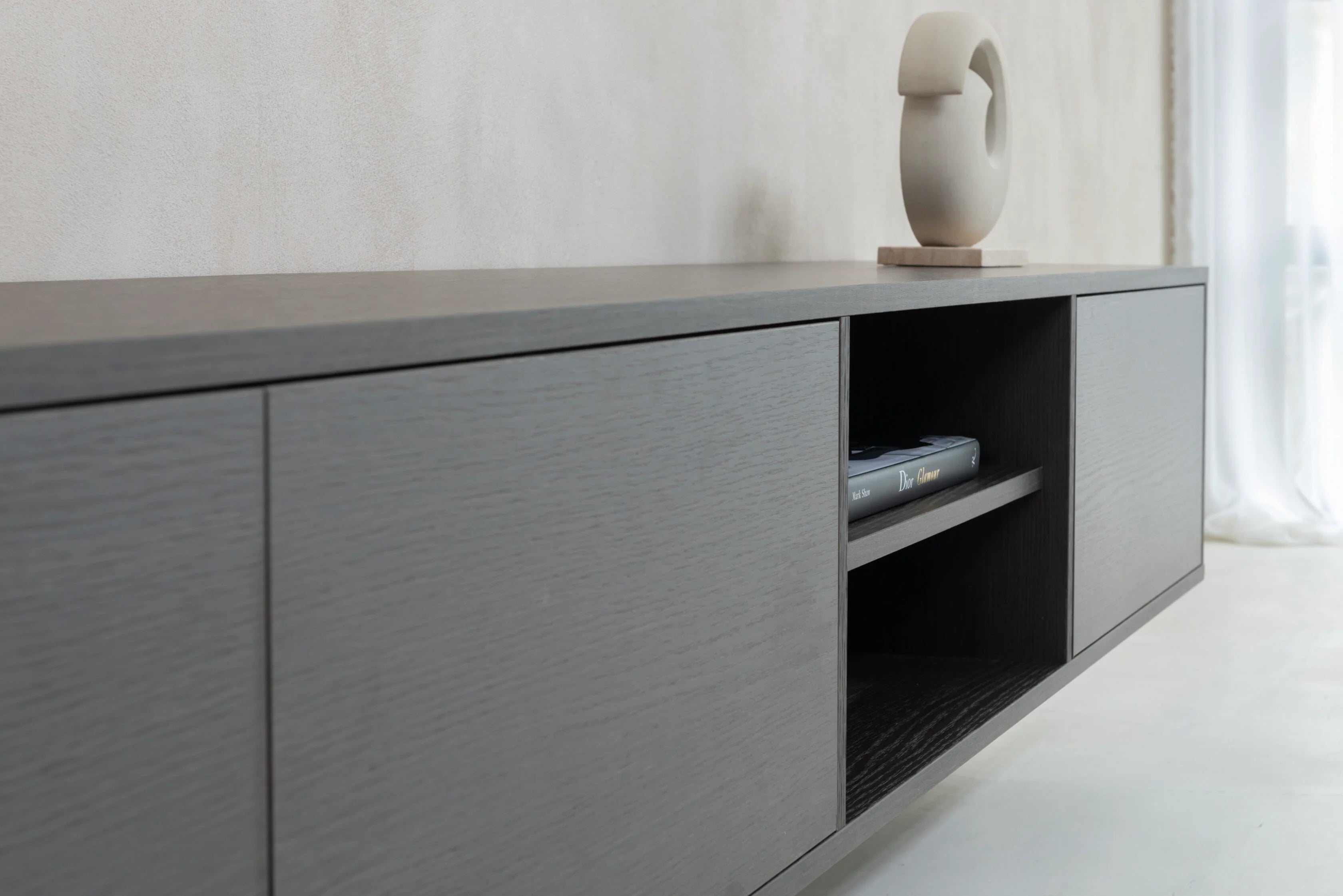 Tv-meubel Stephan staat voor moderne eenvoud en praktisch design. Het meubel heeft een strakke, minimalistische uitstraling en is volledig naar wens samen te stellen. Kies uit hoogwaardige afwerkingen zoals: